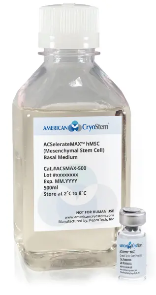 The expansion of human “adult” mesenchymal stem cells (MSCs) in the presence of Fetal Bovine Serum (FBS) presents numerous problems. These may include undesirable epigenetic programming by non-human serum proteins which may lead to inappropriate lineage commitments as well as perturbations and clouding of experimental results. Experimental results obtained when using FBS may also not translate directly or quickly into meaningful applications in the human therapeutic or regenerative medical fields due to the need to replicate experimental results under xeno-free conditions. To circumvent these issues and to support the pursuit of more realistic, more easily translatable experimental results, American CryoStem developed ACSelerateMAX™.